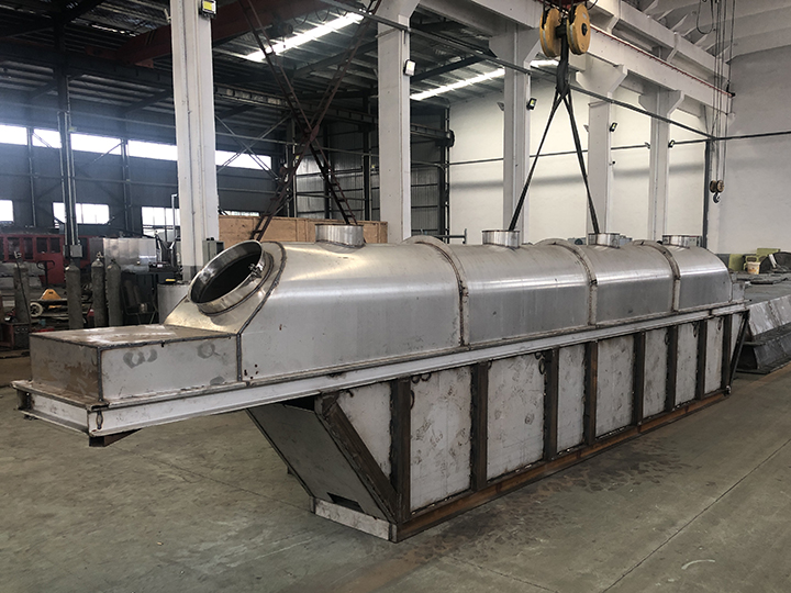 流化床幹燥機的物料自進料(liào)進口進入機(jī)內,在振(zhèn)動力作用下,物料沿水(shuǐ)平麵流化床拋擲,向前連(lián)續運動,熱風向上穿(chuān)過流化床同濕物料(liào)換(huàn)熱後,濕空氣經旋風分離器除(chú)塵後由排風1:3排出.幹燥物料由排料進口排出(chū)。