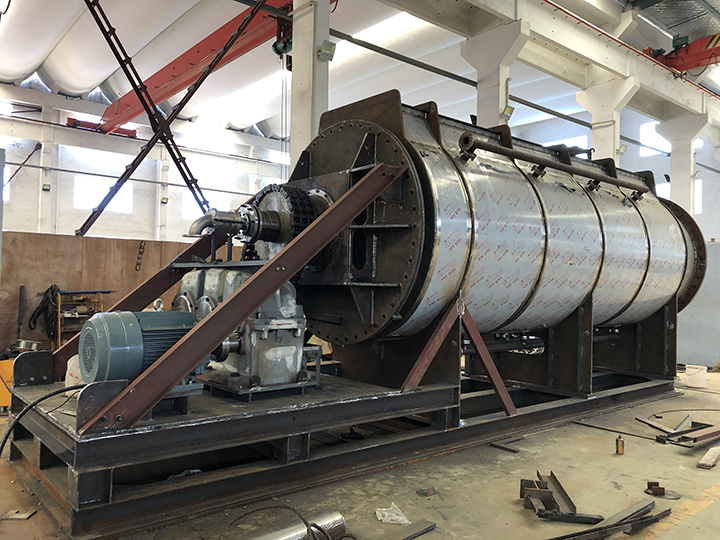 在(zài)密閉的幹燥室內,一根帶有數十片的圓盤的轉子(zǐ)緩慢旋(xuán)轉,熱介質從(cóng)空心軸的一端進入,通過旋轉金屬圓盤將熱量傳遞給物料,物料在金屬圓盤外吸熱(rè)增(zēng)焓不斷(duàn)蒸發濕份,冷卻的熱介質從轉子的另一端排出。轉子周邊通過(guò)固定角鋼架裝有帶一定傾角的(de)刮板,隨著旋轉(zhuǎn)不斷將被幹燥的物料刮起和攪拌(bàn),同時將物料(liào)從入口一側(cè)推向出(chū)口一側。合理地設計幹燥室長度、轉子(zǐ)轉速、刮板數量和角度,能使(shǐ)物料從幹燥室一端前進到另一(yī)端出口處恰好完(wán)成整個幹(gàn)燥過程,蒸(zhēng)發的水分則(zé)由頂部引(yǐn)風機抽出。