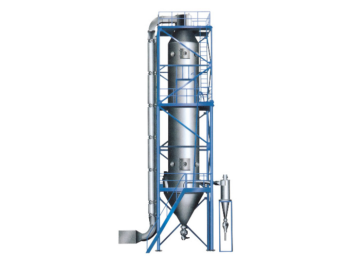 本機組工作過程為料液(yè)通過隔膜泵高壓輸入,噴出霧狀液滴,然後同熱空氣並流下降(jiàng),大部分粉粒由(yóu)塔底排料口收集,廢氣及其(qí)微小粉末經旋風分(fèn)離器分離,廢(fèi)氣由抽風機排出,粉末由設在旋風分離器下端的授粉筒收集,風機出口還可裝備二級除塵裝置,回收率在96-98%以上。