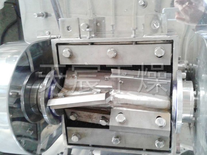物(wù)料由進料鬥送進粉碎室,經刀刃和刀座的衝擊,旋轉刀和固定刀同時剪切粉碎(suì),由於受(shòu)到旋轉(zhuǎn)離心力的作用,物料自動從出口處流出。