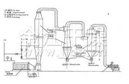 將壓縮空氣或者(zhě)是(shì)水蒸汽用≥300m/s的(de)速度從噴嘴(zuǐ)噴出,靠氣液兩者間的速度差產生的摩擦力,使液料分離成細小的霧滴。霧滴(dī)與熱空(kōng)氣的充分(fèn)接觸並經行熱交換,在10-30秒(miǎo)內迅速完成整個幹燥(zào)過程。