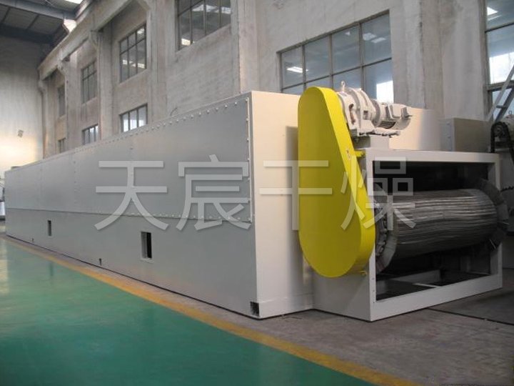 整(zhěng)個生產線為全封閉型(對物料而言),由擺動(dòng)布料段、幹燥段、出料段三(sān)部分組成。擺動布料段作用使海藻均勻(yún)分散在網板上,並且勻速輸送到幹燥段,海藻經過80℃熱風幹燥(zào)段,90℃熱風幹燥段和120℃熱風幹燥段(duàn)後,再經過出料段排(pái)料。循環風向及各單元內風的循環為向下式,即加熱後的空氣由引(yǐn)風(fēng)機吸入,在風機出(chū)風口首(shǒu)先預分布再經過孔板均風後,熱(rè)風從物料的下麵向(xiàng)上(或從物料的上麵向下)穿透物料層(céng)。